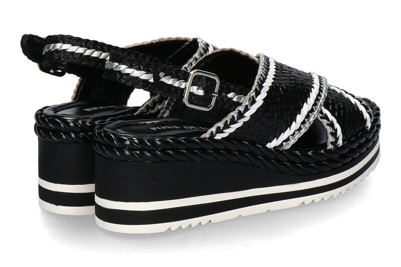 Die Pons Quintana Keilsandale aus schwarzem geflochtenem Leder mit weißen Details ist ein elegantes und vielseitiges Schuhwerk. Die verstellbare Schnalle bietet individuelle Passform, während die weiße Gummilaufsohle für Traktion und Komfort sorgt. Das Lederfußbett gewährleistet angenehme Unterstützung für den Fuß und trägt zum Gesamtkomfort bei. Die Kombination aus schwarzem geflochtenem Leder und weißen Akzenten verleiht der Sandale einen modernen und ansprechenden Look, der sich leicht in verschiedene Outfits integrieren lässt. Ob für einen lässigen Tag oder einen schickeren Anlass, diese Sandale bietet Stil und Funktionalität in einem ansprechenden Design.